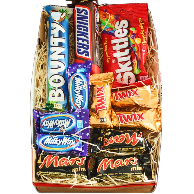 Шоколад Bounty обрадует насыщенным кокосовым вкусом. Мини-конфеты Twix - это песочное печенье с карамелью в молочном шоколаде. Батончик Сникерс с жареным арахисом, карамелью и нугой, покрытых сверху молочным шоколадом максимально зарядит энергией. Каждая конфета драже Skittles имеет твёрдую сахарную глазурь с напечатанной на ней буквой S, причём цвет глазури определяется вкусом.